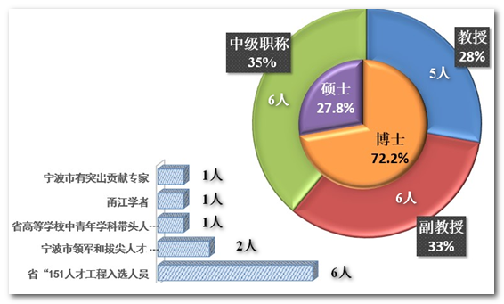 1.专业拥有多个省、市级教学、科研和育人平台,组建了一支学历层次高、科研能力强、实践经验丰富、专业素质过硬的师资队伍,专任教师100%具有研究生学历、72%具有博士学位、65%具有高级职称(教授、副教授)。师资队伍中,2人具有浙江大学认定的博士生导师资格,7人具有浙江大学认定的硕士生导师资格;1人入选浙江省“中青年学术带头人培养对象”,1人入选宁波市“甬江特聘教授”,1人入选宁波市领军拔尖人才第一层次,1人入选宁波市“4321人才工程”第一层次培养对象。专业投巨资建成了各类专业实验室和学生实训实践中心,与省内多家知名企业建立了紧密的产学研合作关系,能为学生提供全真的现场教学和实践机会。