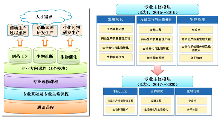 根据学校发展定位,结合地方生命健康产业的发展特色和人才需求,本专业明确了培养“生命健康产业应用型人才”的培养目标, 2015年设置了“生物制药”、“发酵工程与生物催化”、“生物检测”等3个专业主修方向,着力培养天然产物提取、生物催化制药、体外诊断试剂等方向的专业人才。2017年调研了企业的人才需求,相应地将3个专业主修课程模块调整为“制药工艺”、“生物诊断”和“生物催化”,学生需选修其中任意2个模块,以达到既能明确学生能力发展的主要方向,又能拓展学生的知识体系、增强学生适应能力和创新能力的目的。
