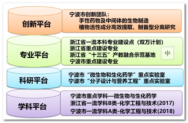 2.本专业科研实力雄厚,重点开展基因工程与微生物定向育种、微生物过程工程、植物细胞培养与天然产物开发、哺乳动物细胞培养与蛋白质药物表达、肠道微生态与机体免疫等科研课题。近年来专业进一步凝练科研方向、整合科研资源、加强校企合作和科研成果转化,已有“手性药物及中间体的生物制造”和“植物活性成分高效提取、制备型分离研究”等2个科研团队入选宁波市创新团队。研究所先后承担了国家自然科学基金项目14项、“973计划”子课题1项、浙江省重大科技攻关项目2项、浙江省自然科学基金项10余项,以及60多项宁波市级和横向合作科研课题,近五年到款总经费超过3000万元,科研成果转化金额超过200万元。研究成果获浙江省科技进步二等奖1项、浙江省科技进步三等奖3项、浙江省高等学校科研成果二等奖1项、宁波市科技进步一等奖1项、宁波市科技进步二等奖2项、宁波市科技进步三等奖5项;教师发表SCI或EI收录的论文200余篇。