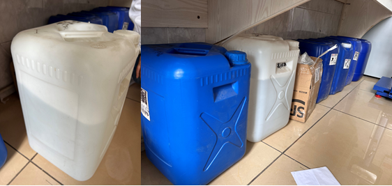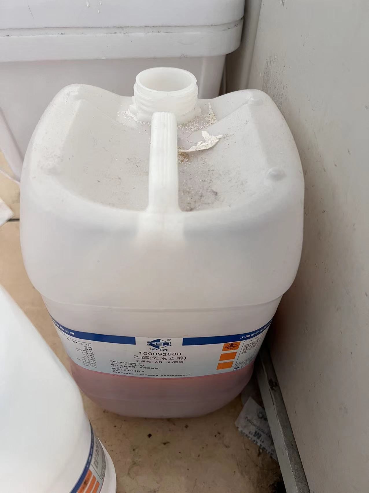 该实验室大量试剂桶未粘贴试剂标签,请及时粘贴并分区存放。