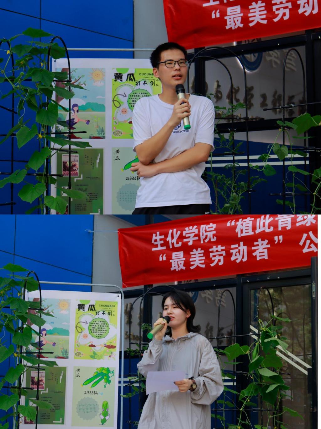 之后,化工223班于海洋与化工专升本221班沈宝怡分别作为植物领养劳动实践代表和学生公寓搬迁志愿者代表发言。于海洋同学指出,在植物领养劳动实践中他接受锻炼、磨炼意志,也让他真真切切感受到劳动人民的伟大和劳动教育的意义。沈宝怡同学指出,在许许多多搬迁同学的付出中,他体会到了正确的劳动观点和劳动态度,这次搬迁也是一种劳动教育,它将促进同学们德智体美劳全面发展。