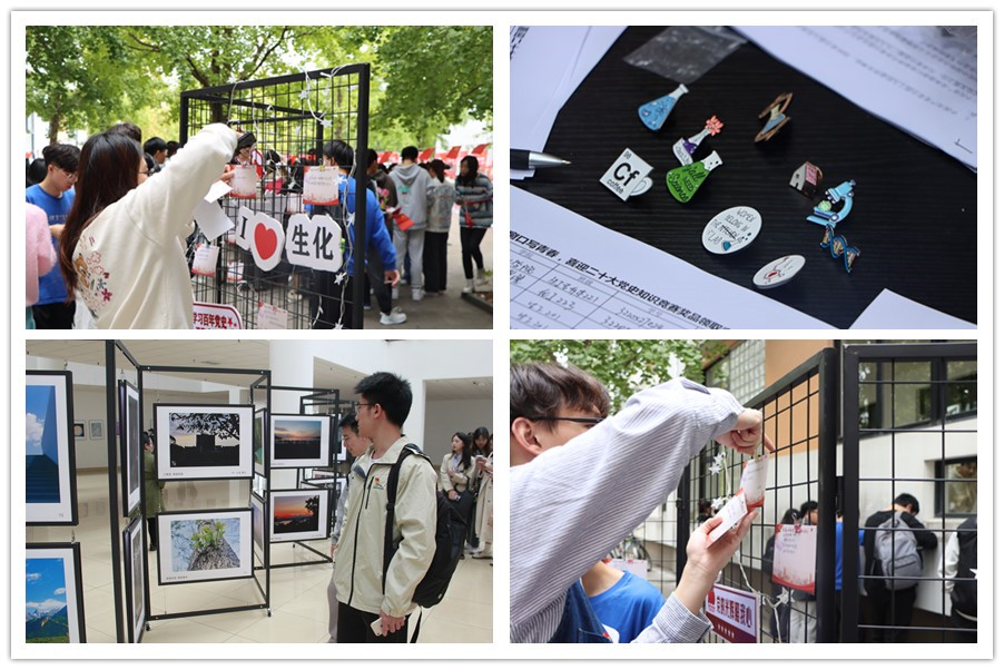 仪式结束后师生共同观看了主题展览。此次展览分为五个板块:“红色摄影”是生化学子运用摄影定格身边的美好瞬间,用画面讲述红色故事,用光影记录校园变化,用镜头记录家乡发展。“青春宣讲”是生化学院、材料学院学生深入学习贯彻党的十九届六中全会精神,以微视角讲大精神,用万家星火书写青春感悟。“党史画卷”是材料学子以“材”绘党史,将艺术与专业学科碰撞,从党的百年奋斗史中汲取凝聚青年的磅礴伟力。“显微摄影”是由材料学院与生化学院学子在实验过程中,各种材料通过显微镜后记录下的画面,通过显微摄影画面感受蓬勃的力量。“奋斗征程”布置了历届党的全国代表大会图文介绍,形成一片红色的海洋。此版块还设置了党史知识竞赛、青春寄语积分闯关活动。