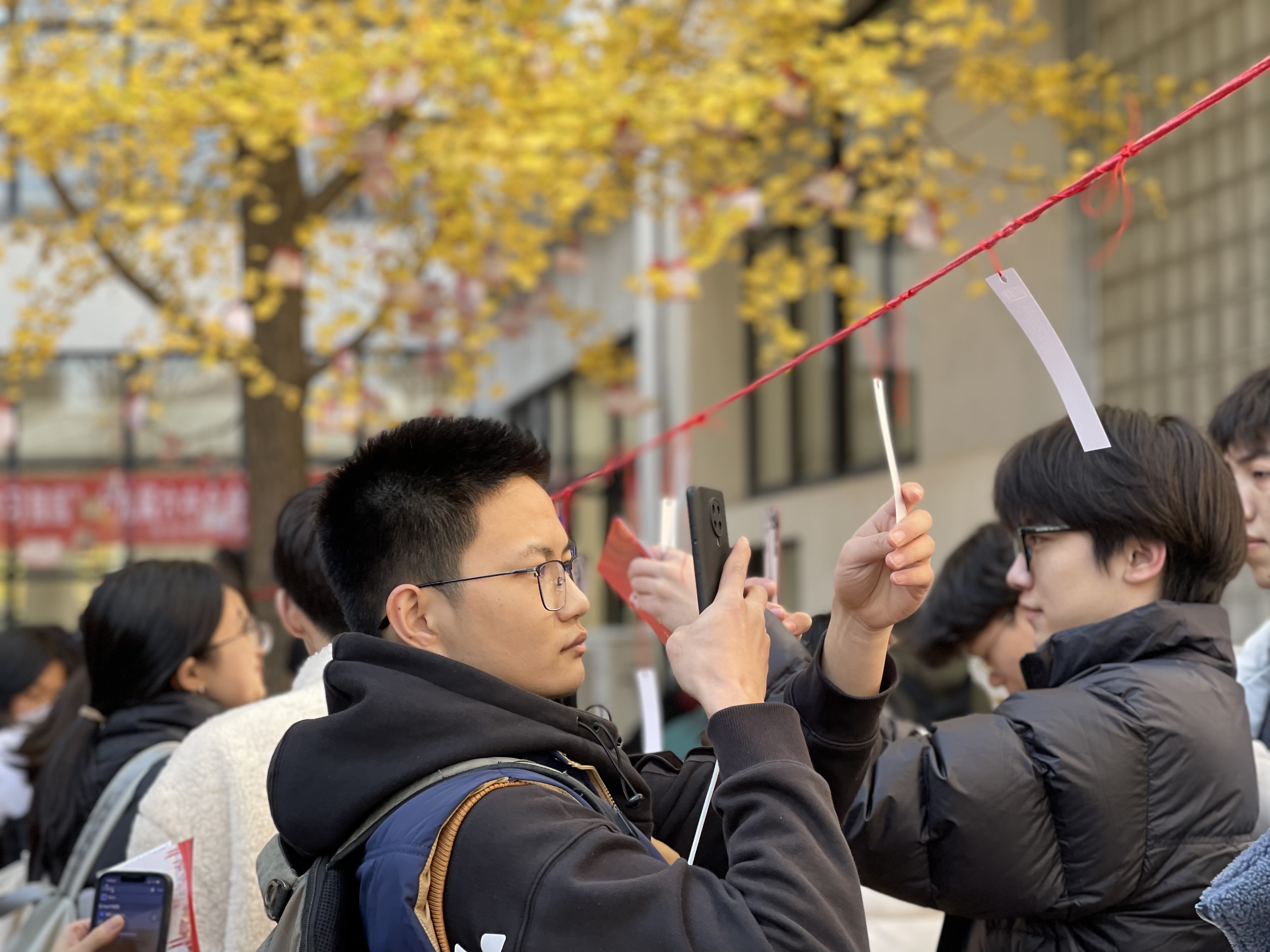 中午时分,学生党员们结伴而来,活动现场立马充满了生机,本次主题党日活动是积分闯关,大家累计答对5道题目可以获得一枚印章,进入下一关,写下给党的三行情书或十九届六中全会的学习心得便可获得第二枚印章,将写满祝福的明信片挂在心愿墙即完成本次闯关任务,可兑换到一枚精美的“新青年”勋章。随着活动的进行,参与的党员越来越多,现场热烈的氛围也吸引来往的师生驻足停留,参与其中,互相交流着答题心得,欣赏着同学们写下的祝福,一个小时的活动让很多师生意犹未尽。