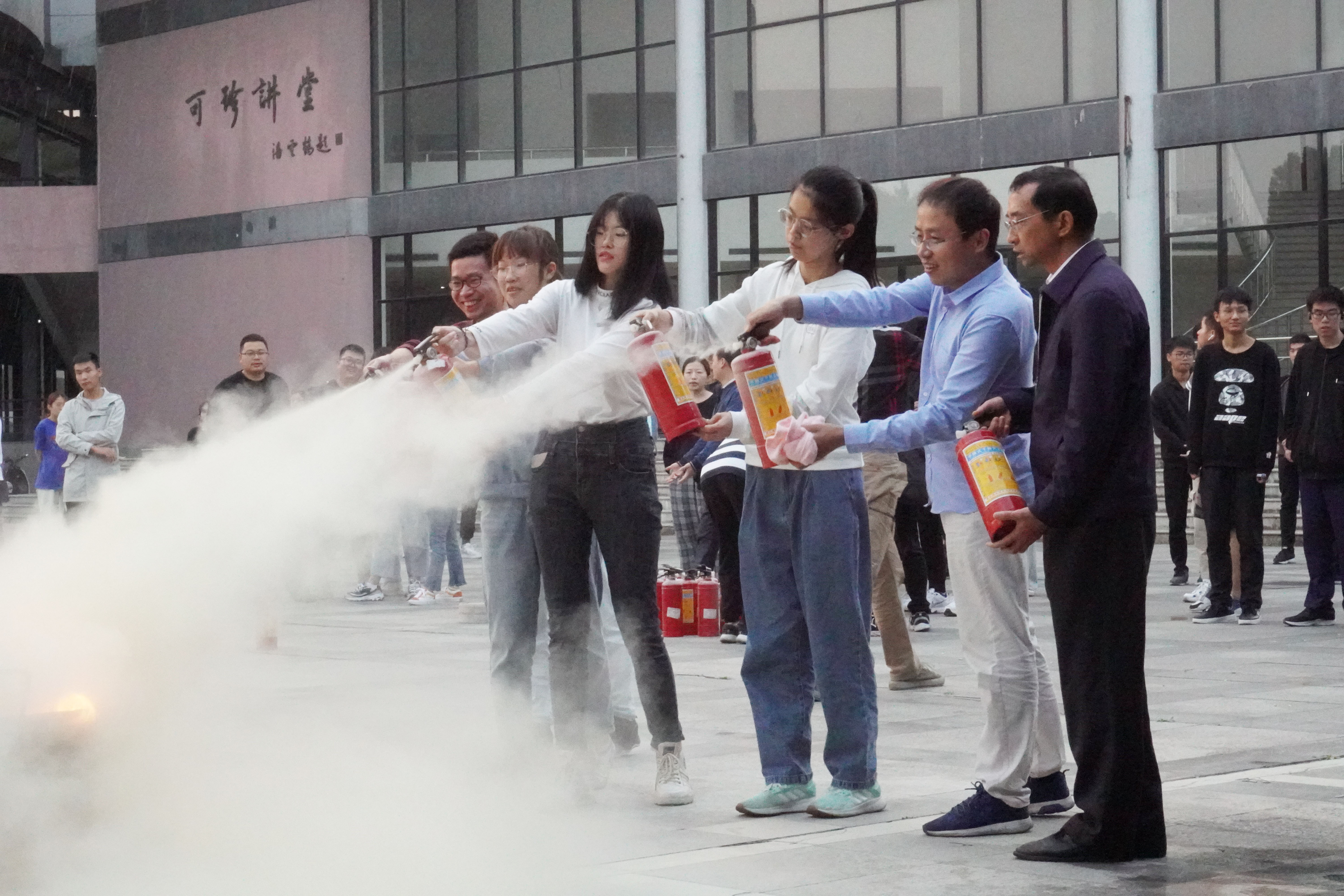 16点10分,演习正式开始。两个学院的师生在消防引导员的哨声指引下,按指定逃生线路从教学楼快速撤离,前往石麟大楼安全点汇合。完成疏散任务后,燕永波老师进行了安全讲座,介绍各类火险应对方式,详细讲解并演示干粉灭火器的使用方式。随后,在燕老师及校卫队员的指导下,师生们轮流操作灭火器进行现场灭火。