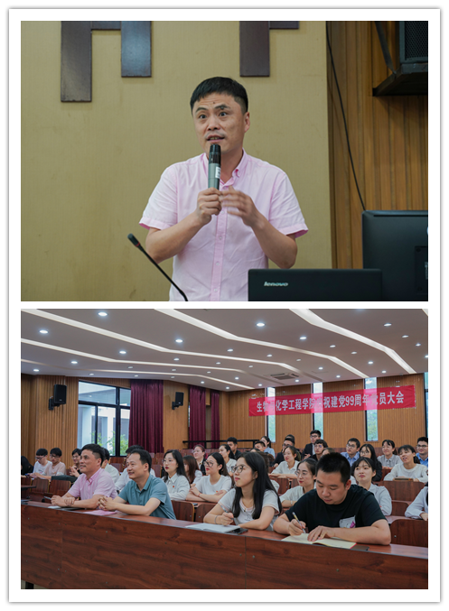 6月29日下午16:00,生化学院庆祝建党99周年党员大会在NC103召开。学院党委书记楼文军、党委副书记赵涵参加会议,学生党支部全体党员参加本次大会。会上楼文军书记代表学院党委向全体党员上了一堂题为《九十九载不忘初心,二0二0砥砺前行》的主题党课。会议由学院党委组织委员李桢主持。