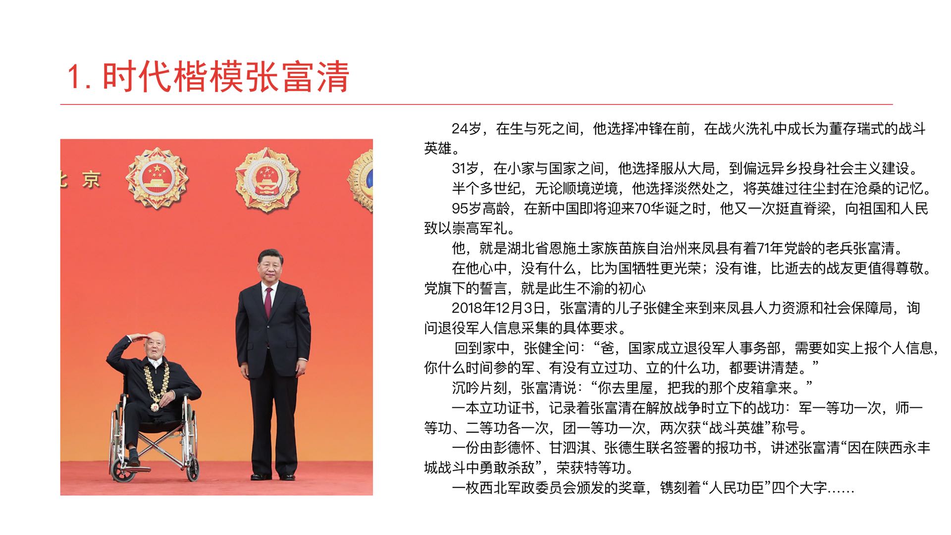 之后,吴霄雄介绍了时代楷模张富清和杜富国的先进事迹。党员在观看了他们的纪录片后,全体党员内心都深受鼓舞,颇有感触。张富清,一位96岁的老党员,60多年来刻意尘封战功,一辈子坚守初心、不改本色。在张富清同志身上,学习到了他的坚守初心、对党忠诚;他的淡泊名利、甘于奉献;他的恪尽职守、担当使命。吴霄雄强调我们要以“全国优秀共产党员”张富清同志为榜样,视他为明镜,把使命和责任扛在肩上,不忘初心,牢记使命,不断强化“四个意识”,坚定“四个自信”,做到“两个维护”,永远跟党走。杜富国是边境陆军某扫雷排爆大队一名90后战士。入伍以来,他始终把忠诚和信仰刻在心中,主动请缨征战雷场,为人民利益和边境安宁挥洒自己的热血。中共党员忠诚坚定的理想信念和为民奉献的家国情怀在他身上表现的。中国共产党从诞生至今,已然走过99年的光辉历程,道路上充满了苦难,也充满了辉煌。可以说没有共产党就没有新中国,历史和人民选择中国共产党领导中华民族伟大复兴事业是正确的,必须长期坚持,毫不动摇的。
