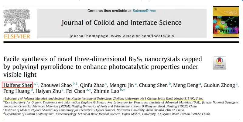 近日,我院本科生发表论文质量再获突破,以第一作者首次发表JCR一区(JCR一区指该学科所有期刊上一年度影响因子排列前25%的期刊)研究论文,高分子材料与工程专业16级本科生沈海峰在胶体与界面科学领域顶级期刊Journal of Colloid and Interface Science(影响因子6.361)上以第一作者发表了题为“Facile synthesis of novel three-dimensional Bi2S3 nanocrystals capped by polyvinyl pyrrolidone to enhance photocatalytic properties under visible light”的研究论文,论文的通讯作者为我院教师陈飞副教授,共同作者包括高分子材料与工程专业17级本科生金梦如同学、邓萌副教授和钟国伦教授。