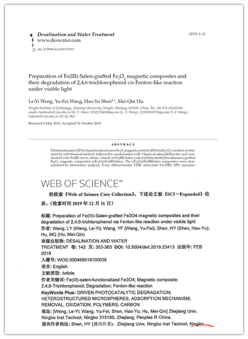 以化学工程与工艺专业2015级本科生翁乐仪为第一作者,我院教师沈昊宇教授为通讯作者的SCI论文“Preparation of Fe(III)-Salen-grafted Fe3O4 magnetic composites and their degradation of 2,4,6-trichlorophenol via Fenton-like reaction under visible light”发表在环境科学与生态学领域期刊Desalination and Water Treatment。