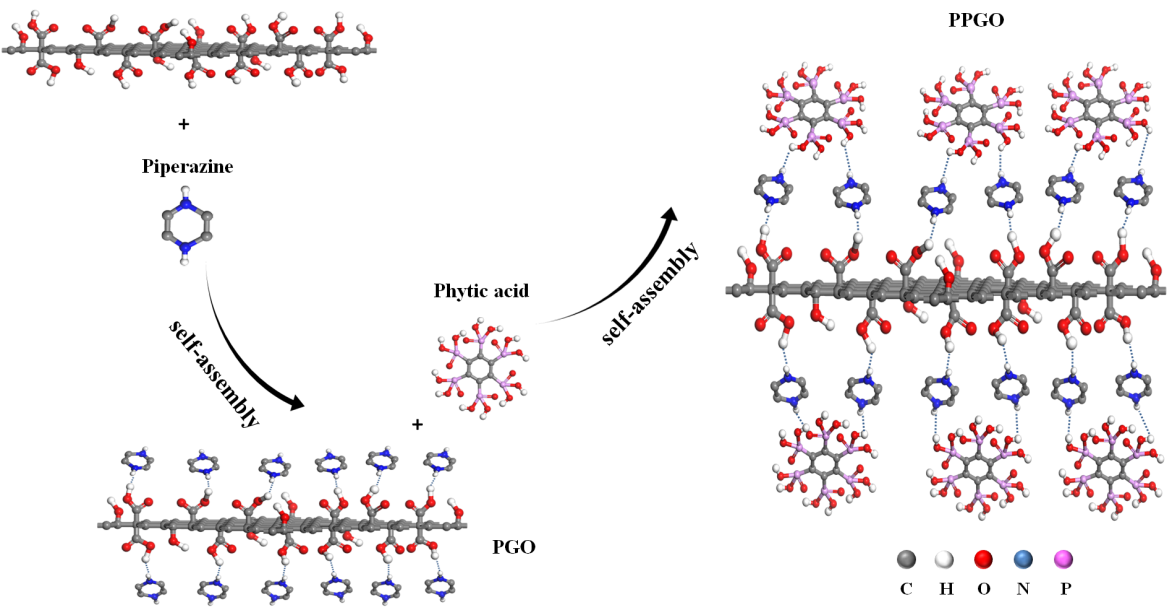 该论文通过植酸、哌嗪与氧化石墨烯(GO)自组装得到氮、磷共掺杂的氧化石墨烯(PPGO),并研究了PPGO对环氧树脂(EP)燃烧性能的影响,制备方法见下图。此研究工作得到了国家自然科学基金海外及港澳学者合作研究基金的资助。