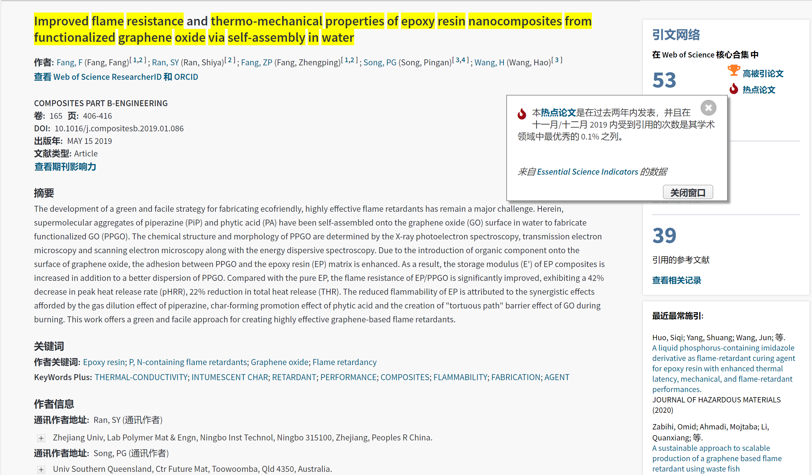 近日,方征平教授团队题为“Improved flame resistance and thermo-mechanical properties of epoxy resin nanocomposites from functionalized graphene oxide via self-assembly in water”的研究论文被识别为EssentialScience Indicators高被引论文和热点论文(在过去两年内发表,并且在2019年十一月/十二月内受到引用的次数是其学术领域中最优秀的0.1%之列)。该论文于去年五月发表在期刊Composites Part B: Engineering上(影响因子6.964),论文的通讯作者为我校教师冉诗雅和澳大利亚南昆士兰大学宋平安博士,第一作者为方征平教授和冉诗雅副教授共同指导的博士研究生方芳同学。