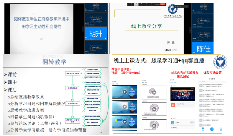 邹建卫、胡升、钟国伦、陈佳四位老师分享了各自线上教学的做法。邹建卫老师分享了如何在线上建课、课堂设计及课堂教学管理三方面上好一堂网课;胡升老师就如何激发学生在网络教学环境中的学习主动性和自觉性,分享了课前、课中、课后进行有效的翻转课堂教学设计做法;钟国伦老师在开课之前提前调研不同教学平台优劣势,综合运用钉钉软件进行实时互动教学、微信群进行课后教学效果评估;陈佳老师则分享如何利用平台资源引用优秀课程资料建课,课堂学生互动管理、课后分析及调整方案。