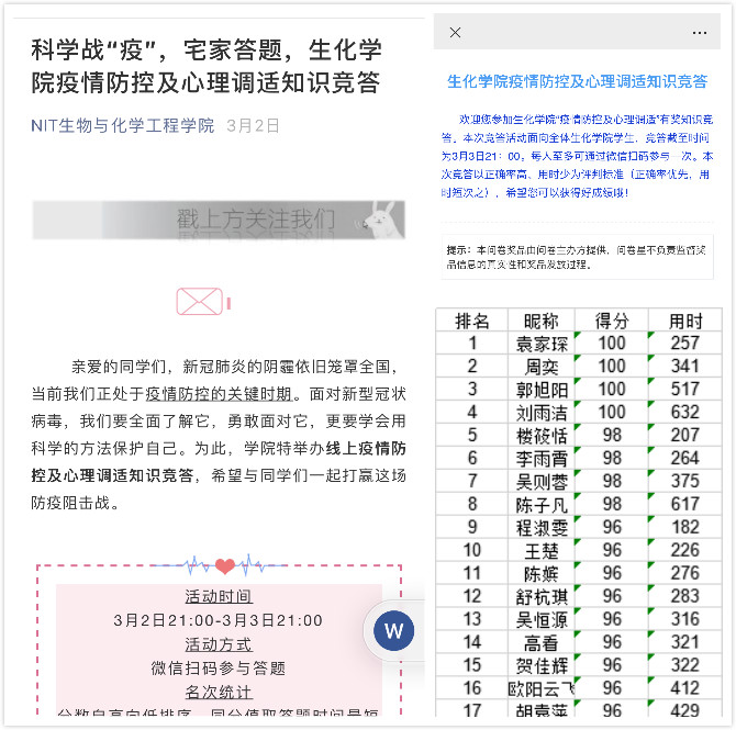 进一步加强新冠肺炎防控知识宣传力度,提高学生科学防护能力,近日,生化学院特开展‘科学战,宅家答题’线上疫情防控及心理调适知识竞答,旨在以赛促学、以学促行,引导同学们依法防疫,科学防疫,理性防疫,在加强自我防护的同时,助力全民防疫防控工作。