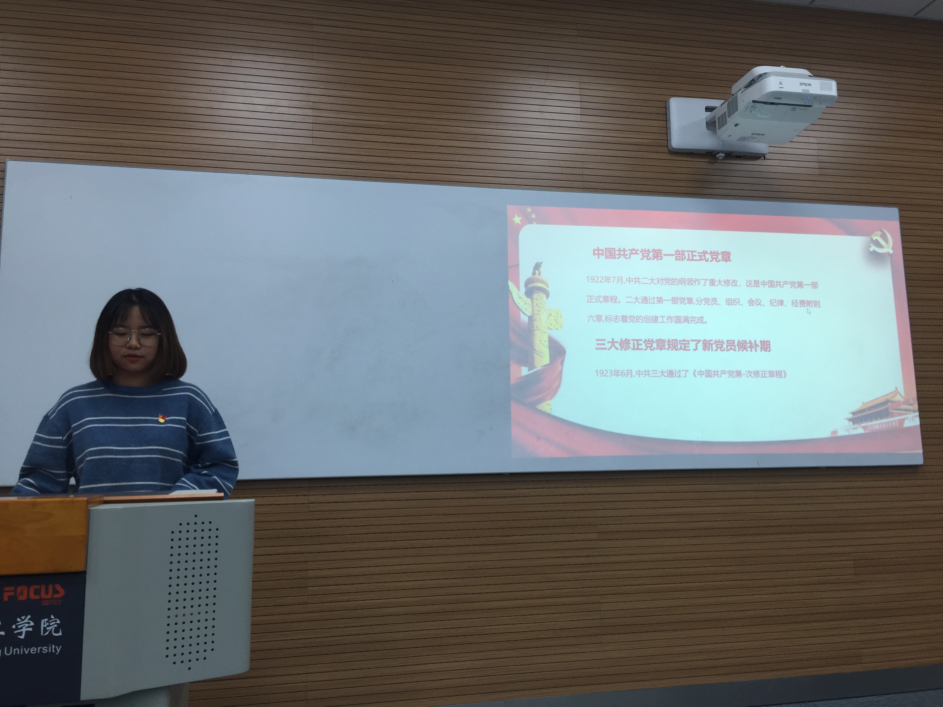 支部支委朱慧慧同志从中国共产党第一部正式党章开始,详细讲述了党章的发展历程。让支部党员同志们深刻了解并领悟到我们党历来高度重视制定和完善党章。从中共二大指定第一部正式章程到党的十九大,中国共产党先后17次修改党章。每次对党章的修改和完善都反映了党对自身建设规律进行探索的情况,记录着党的历史发展进程。在90多年的奋斗历程中,我们党总是认真总结革命建设改革的成功经验,及时把党的实践创新、理论创新、制度创新的重要成果体现到党章中,从而使党章在推进党的事业、加强党的建设中发挥了重要指导作用。