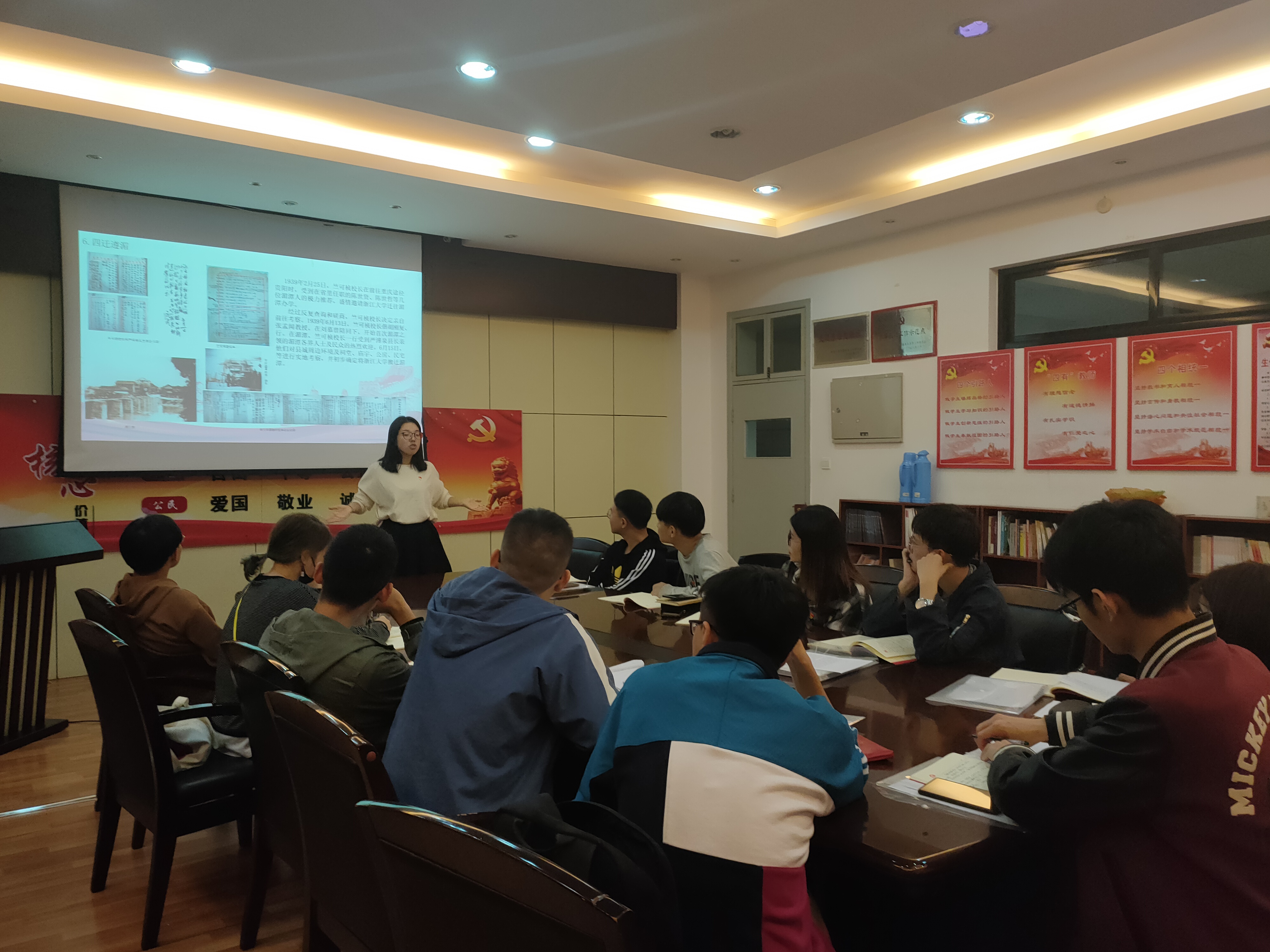 闫雪茹老师从浙大西迁历史出发,围绕文军长征过程中的涌现出的先进人物和事迹,全方位、多角度讲述了老一辈浙大人如何在民族危亡之际担起“教育兴国,科研兴邦”的重任,如何在颠簸流离流亡办学中凝练和坚持“求是”精神。她指出浙大师生的责任意识和担当意识才成就了文军西征,他们的清风傲骨和实事求是的品格铸就了求是精魂。日军的轰炸无法阻挡师生坚持求学报效祖国的热情,在一次次迁徙中学校逐步壮大,为国家培养了一批批优秀科研人才和爱国志士。在和平年代的我们更应坚持奋斗,面对新时期、新阶段,更要增强开拓前进的勇气与力量。