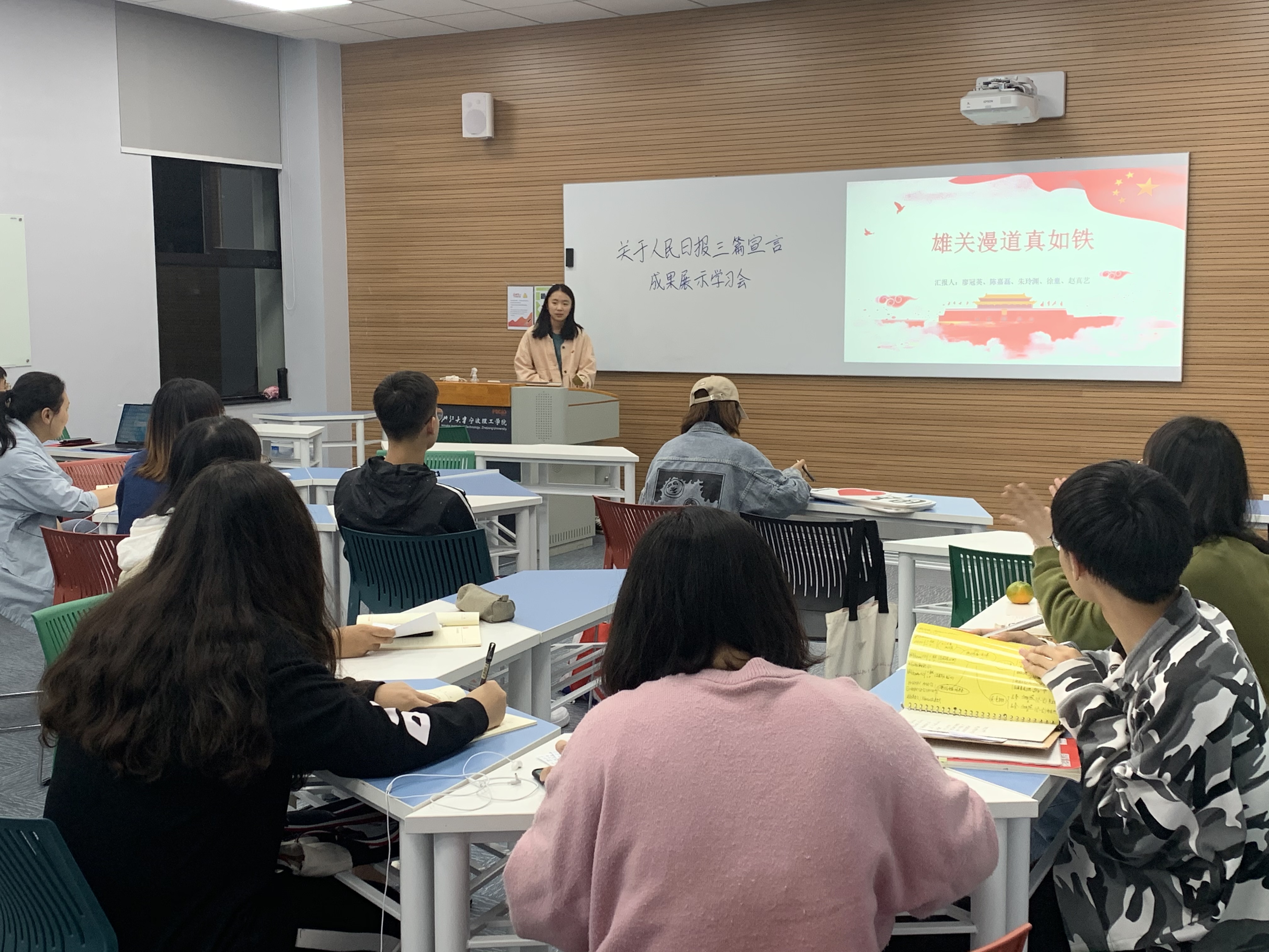 此次党日活动通过学习人民日报发表的三篇“宣言”,每组学生党员以PPT答辩的形式进行宣言解读和学习心得分享。在展示过程中带着大家回望了新中国七十年来的披荆斩棘、风雨兼程,也深刻体会到了中国共产党人矢志不渝的初心和使命,共同见证了中国如今的辉煌与成就,盛满了对新时代中国特色社会主义的期待。更加意识到“未经黑暗,便不见光明的可贵;历经磨难,才深知复兴的意义。”