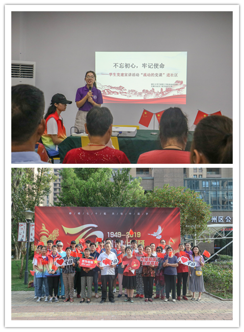 9月29日下午,生化学院学生党支部、求是黔进宣讲团的带领来到鄞州区和顺社区,以“两段长征路,一曲初心颂”为主题开展“流动的党课”进社区学生党建宣讲活动。宣讲以红军长征的转折点和文军长征(浙大西迁)的办学地贵州遵义为起点,一方面旁征博引,多维度、多层次的向大家详细介绍了中国共产党在长征途中的艰难险阻,用“四渡赤水”、“强渡大渡河”、“爬雪山过草地”等多个小故事来体现共产党人救国救民的信仰。另一方面以浙大师生坚持国家民族的教育事业、保存知识文化精英为主线,从西迁背景、西迁历程、读书不忘抗日救国三个方面,回顾了抗日时期浙大西迁流亡办学之路,诠释了浙大师生为党为国做贡献的“求是”精神。最后,所有参与者一起演唱了《我和我的祖国》,向新中国七十周年献上生日祝福。整场活动给现场人员以别具一格的视听感受,让人耳目一新、意犹未尽。