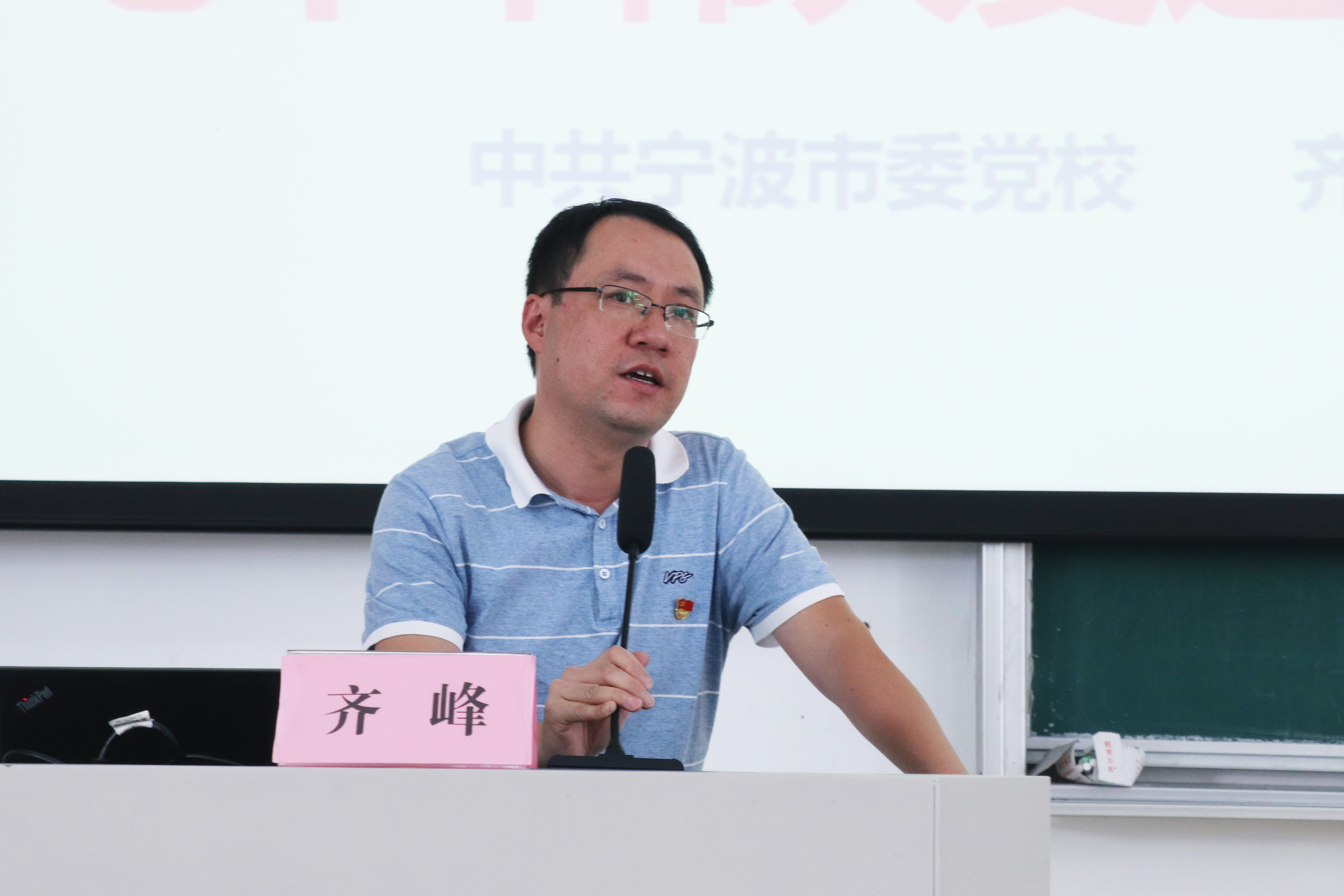 2019年9月20日下午,生化学院与商学院、土建学院全体师生党员于SB102听取了中共宁波市委党校副教授齐峰关于 “中国共产党人的初心与使命——七十年伟大变迁的根本动力”的主题讲座。他从中国共产党人的初心和使命“从哪里来、到哪里去”两个方面进行阐述,强调中国共产党人的初心和使命,就是为中国人民谋幸福,为中华民族谋复兴。他从“红船精神”讲起,强调每位党员都应具备开天辟地、敢为人先的首创精神,坚定理想、百折不挠的奋斗精神和立党为公、忠诚为民的奉献精神,都应当为夺取新时代中国特色社会主义伟大胜利、实现中华民族伟大复兴的中国梦不懈奋斗。
