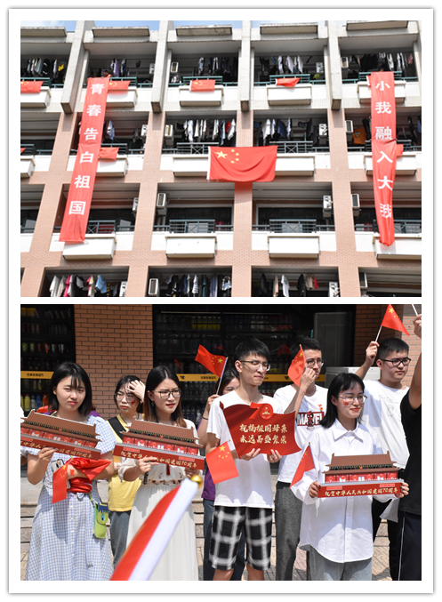 伴随着《我和我的祖国》、《红旗飘飘》、《没有共产党就没有新中国》、《东方之珠》、《唱支山歌给党听》等一首首脍炙人口的爱国爱党歌曲,过往师生纷纷自发驻足伴唱,手持小国旗,并贴上了“飘扬的五星红旗”,宿舍22幢楼上的同学们也自发来当阳台齐声高歌,几曲唱罢,动听的歌声飘荡在空中,深深爱国情感染着每一位参与的师生。70年光阴转瞬即逝,今天,富有朝气的宁理学子站在时间节点上,将以更加饱满的热情,不忘初心,砥砺前进,弘扬时代正能量,唱响主旋律,励志实现中国梦!