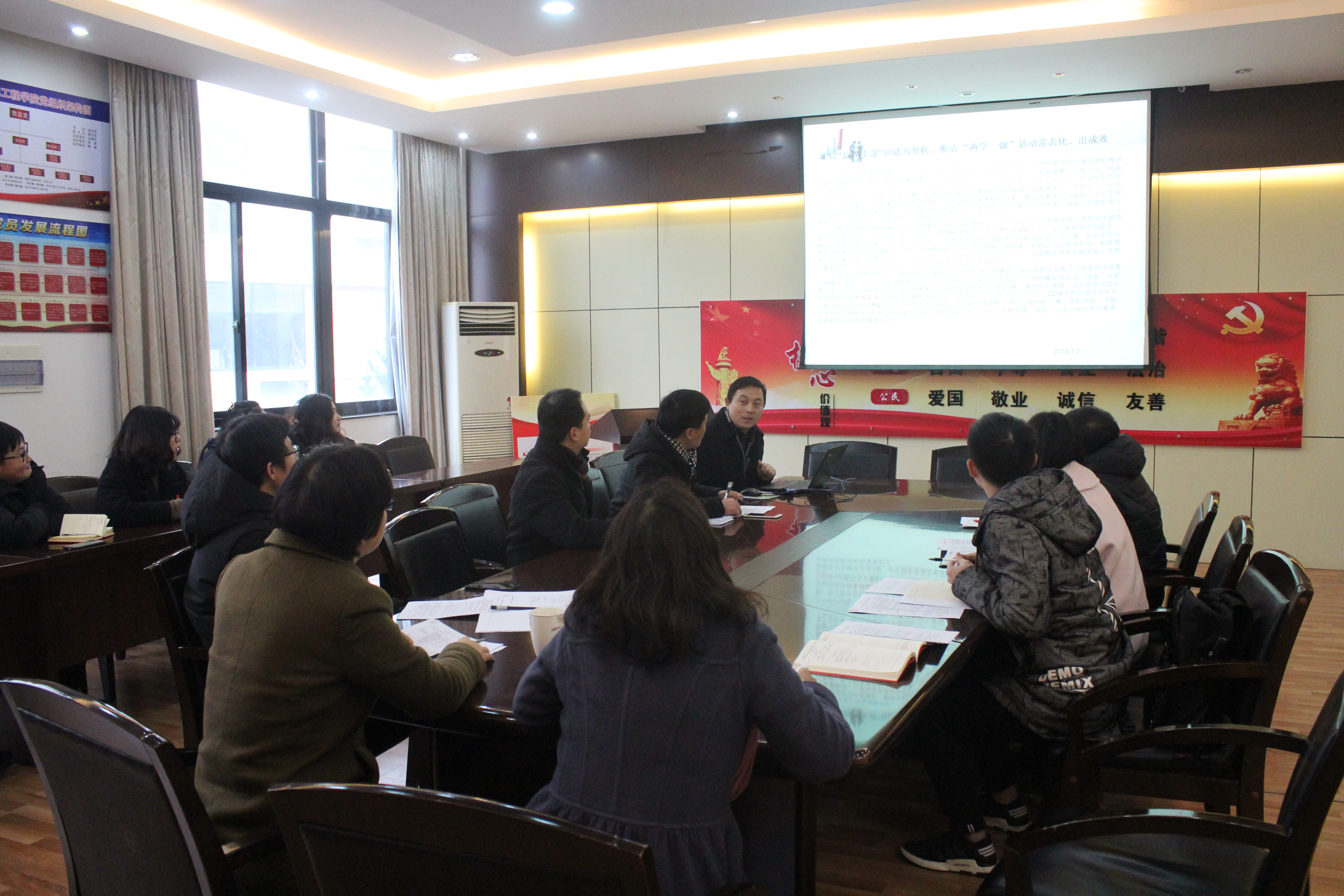 学院党总支副书记楼文军肯定了各支部2018年度党建工作上取得的进步,特别在推进“两学一做”学习教育常态化、制度化,认真落实“三会一课”制度,发挥基层党支部战斗堡垒作用方面取得了较好的效果。同时他对党支部工作提出了三个期望:一是进一步加强党支部规范化建设,按照《中国共产党支部工作条例(试行)》等要求开展好各项工作;二是进一步探索建设着力点,结合学院中心工作,挖掘特色亮点,推进品牌支部建设;三是进一步提高履行党建工作职责的认识,强化党员主体意识,做好身份亮显,充分发挥党员的先进模范作用。