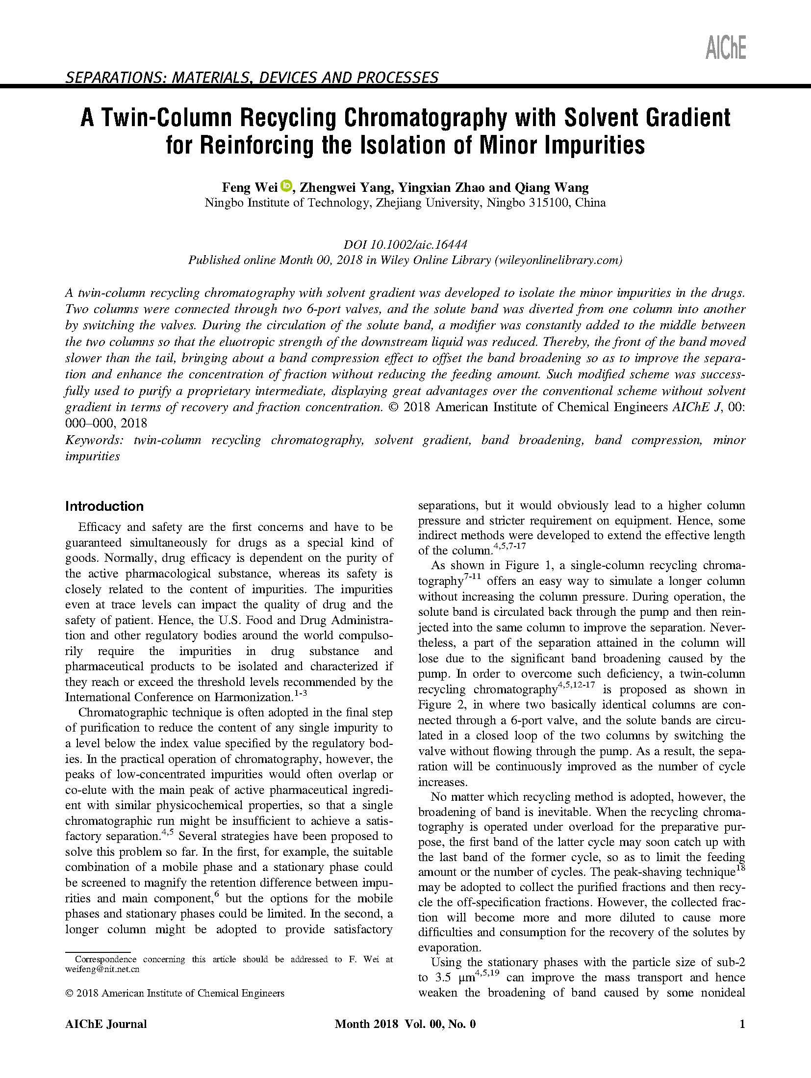 生化学院科研团队投送的题为《A twin-column recycling chromatography with solvent gradient for reinforcing the isolation of minor impurities》的研究论文,近日在工程技术-化工领域顶级学术期刊《AIChE Journal》(ZJU100)上发表,该文第一作者为危凤副教授,共同作者包括硕士研究生杨正伟同学和王强教授等。