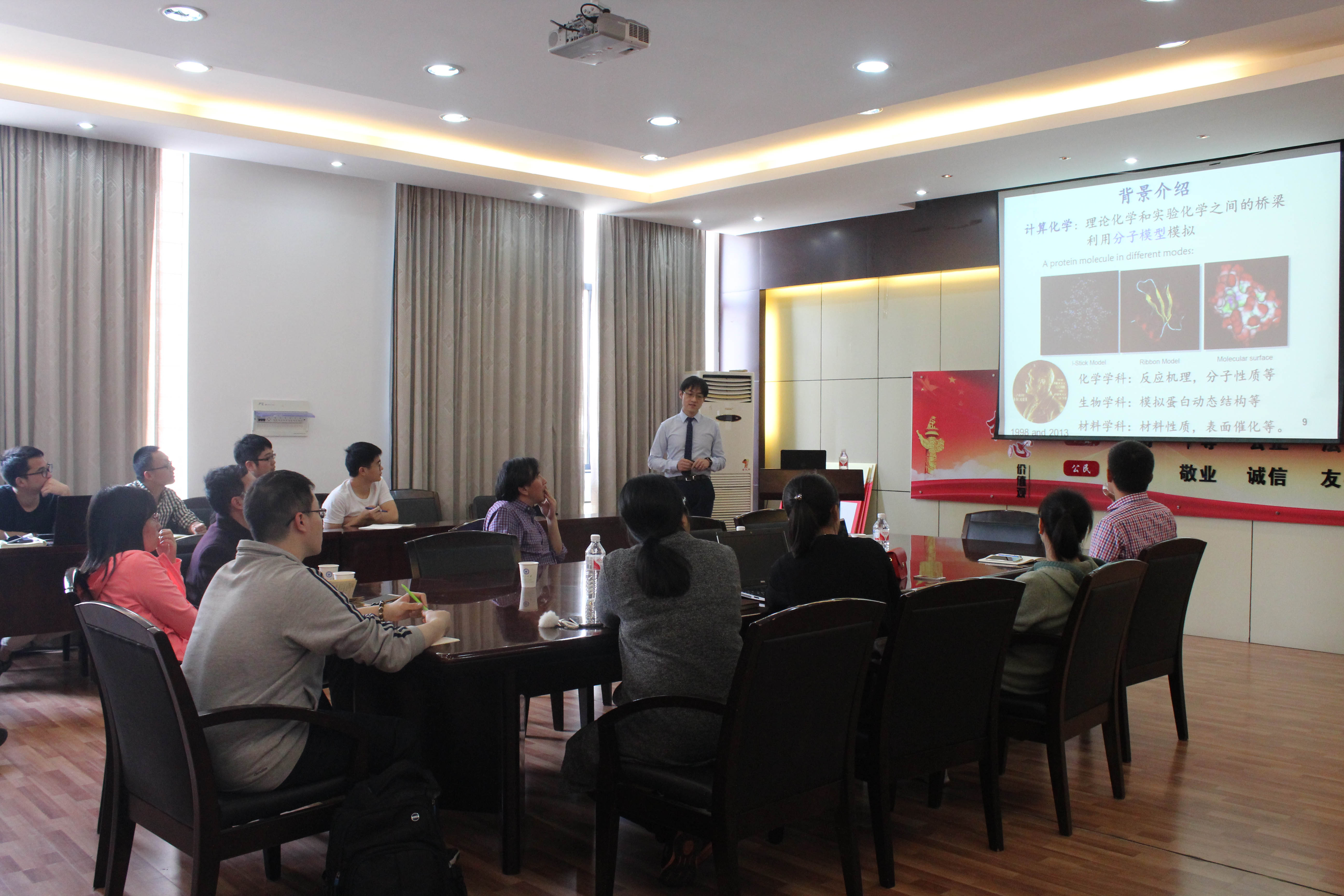 彭谦研究员的报告主要从三个方面展开:首先介绍了计算化学的发展历史和前沿知识以及计算化学在当代化学中的重要意义。随后介绍手性分子与生物大分子的识别作用手性分子在药物及其他领域的重要作用。手性不同的两种物质往往会化学性质大相径庭,所以在手性分子的合成和利用过程中化学家要更加小心的甄别和使用。最后他介绍到,手性分子可以通过计算化学的途径进行理性的设计,找到开启化学反应的“钥匙”是计算化学相对于实验的长处和优点。随着科学技术的进步,计算机运行速度大幅度提高,计算化学能够为实验提供更加科学的导向,这也是计算化学的亮点和意义。