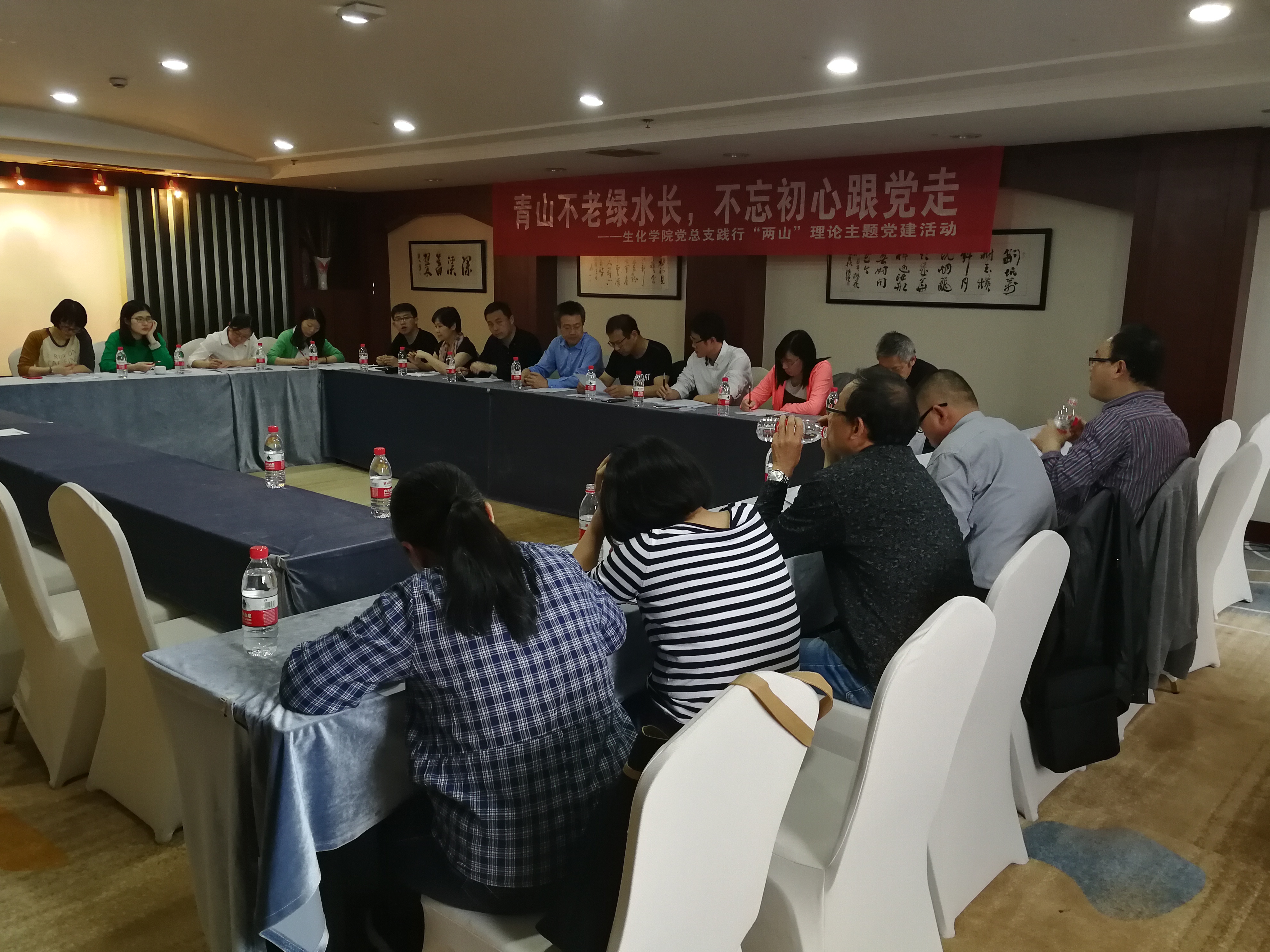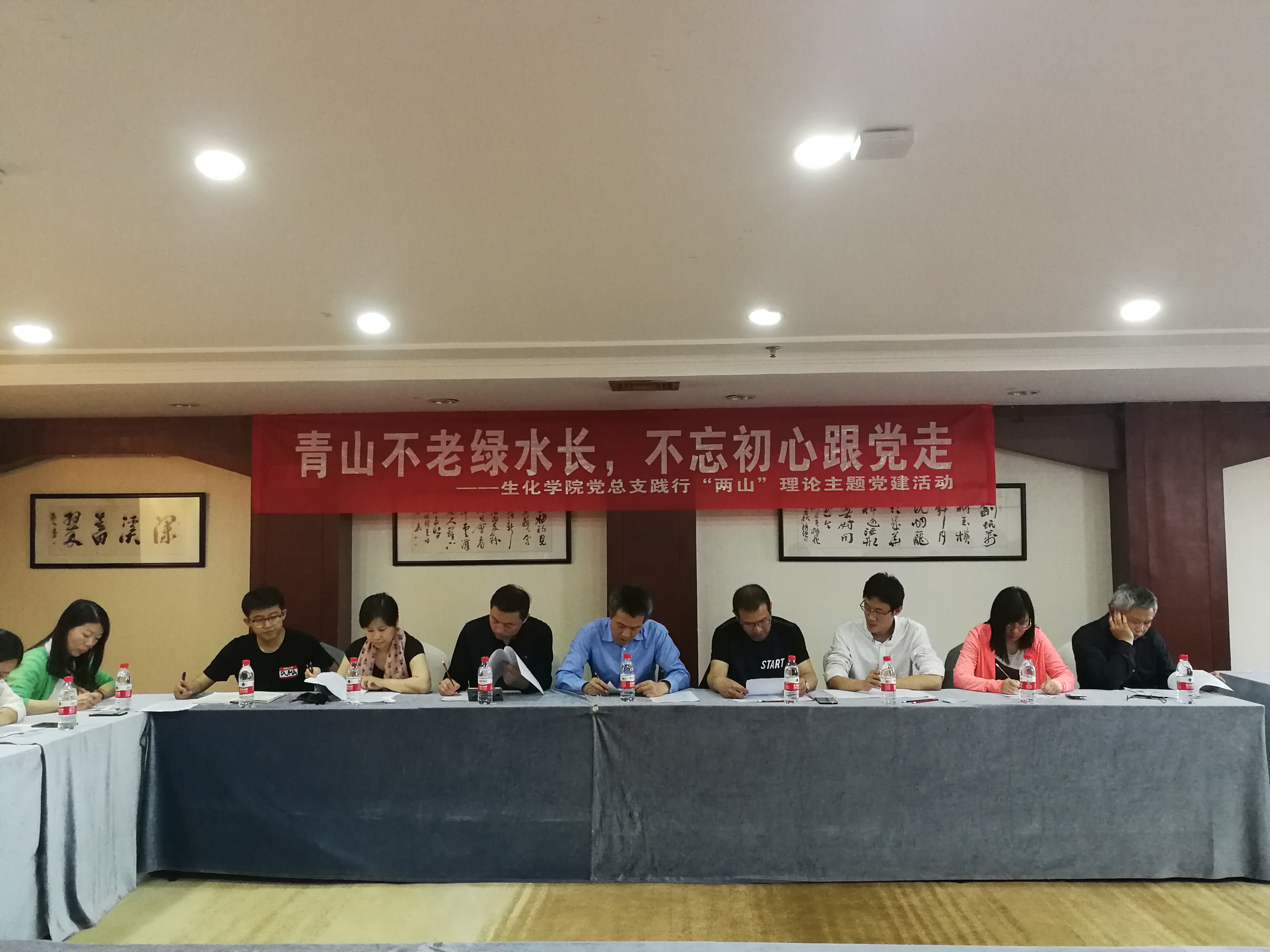 参观完余村,党总支举行了“两山”理论及宪法修正案学习会。会议由金志华书记主持,他对“两山”理论进行了详细解读,并结合学院自身专业特点,表示践行“两山”理论对生化学院具有重要的引领意义!传统化工行业虽然推动了经济增长,却也由此造成了资源环境问题,这就要求我们不断进行技术革新,向“绿色”产业升级发展,走经济与生态双赢的可持续发展道路。随后,金志华书记就生化学院党建工作重点和工作方案进行了详细阐述,由张硕老师对宪法修正案进行了详细解读,与会党员纷纷发言,表示要树立宪法意识,弘扬宪法精神,真正做到尊崇宪法。会议最后,方征平院长将我院实际情况与党建工作结合,布置了学院下一阶段的重点和难点工作,尤其提出在接下来的学科评审中,党员教师要起到先锋模范作用。