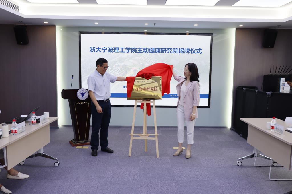 △宁波市卫健委副主任李湘虹、副校长鲁东明共同为主动健康研究院揭牌
