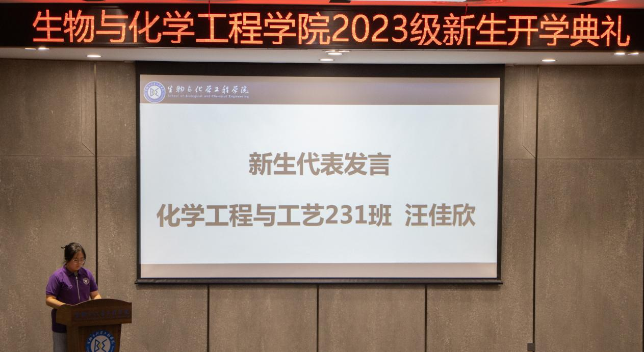 新生代表则是来自化工231的汪佳欣同学,她代表全体新生在台上表达了自己对大学生活的憧憬与向往,提出了自己的目标与期望,象征了生化学子积极向上的青春活力。