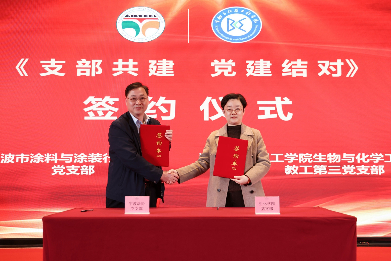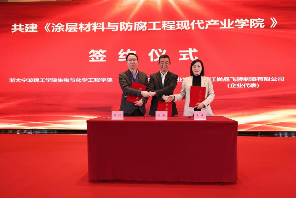 3月22日,生化学院与宁波涂协开启全面战略合作,在2024•涂料产业绿色高质量发展论坛暨宁波涂协六届四次会员大会上,学院副院长王进波与宁波市涂料与涂装行业协会会长汪立波、企业代表浙江尚品飞轿制漆有限公司董事长林巧,共同签署“涂层材料与防腐工程现代产业学院”共建协议;学院教工第三党支部书记代冬梅与宁波涂协党支部副书记李红良共同签署党建结对协议。