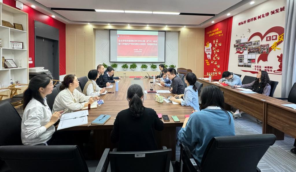 4月29日,生化学院党委理论学习中心组联合校资产与实验室管理处党支部开展《中国共产党纪律处分条例》专题学习会,深入学习贯彻习近平总书记关于党纪学习教育的重要讲话和重要指示精神,进一步强化纪律意识、规矩意识,不断把党纪学习教育引向深入,为学院高质量发展提供坚强纪律保障。学院党委书记刘哲主持会议,资产处、生化学院党委理论学习中心组全体成员、学院纪委委员、支部书记及部分教师代表参加会议。