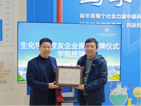 现场举行校友企业捐赠授牌仪式,杭州奕安济世生物药业有限公司向生化学院捐赠价值20万元的试验耗材,由刘哲书记接受捐赠,并向企业代表管其君(01级生工专业校友)颁发捐赠证书。管其君感谢学院的悉心培育,在未来的日子里,也会积极参与校友会的活动,为学院的发展贡献自己的力量。