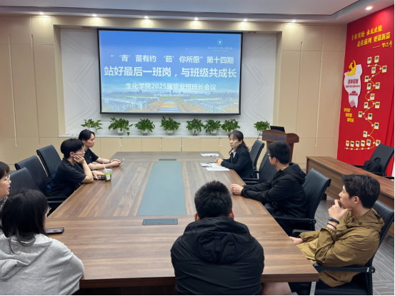 2025年4月23日,生化学院举办了“青”苗有约“茹”你所愿第十四期活动,活动主题为“站好最后一班岗,与班级共成长”。旨在持续保障毕业班安全稳定、推动毕业生就业工作,同时强化毕业班班干部的责任意识。学院党委副书记王常青、毕业班辅导员及各毕业班班长参加了此次活动。