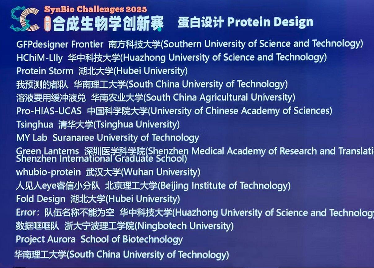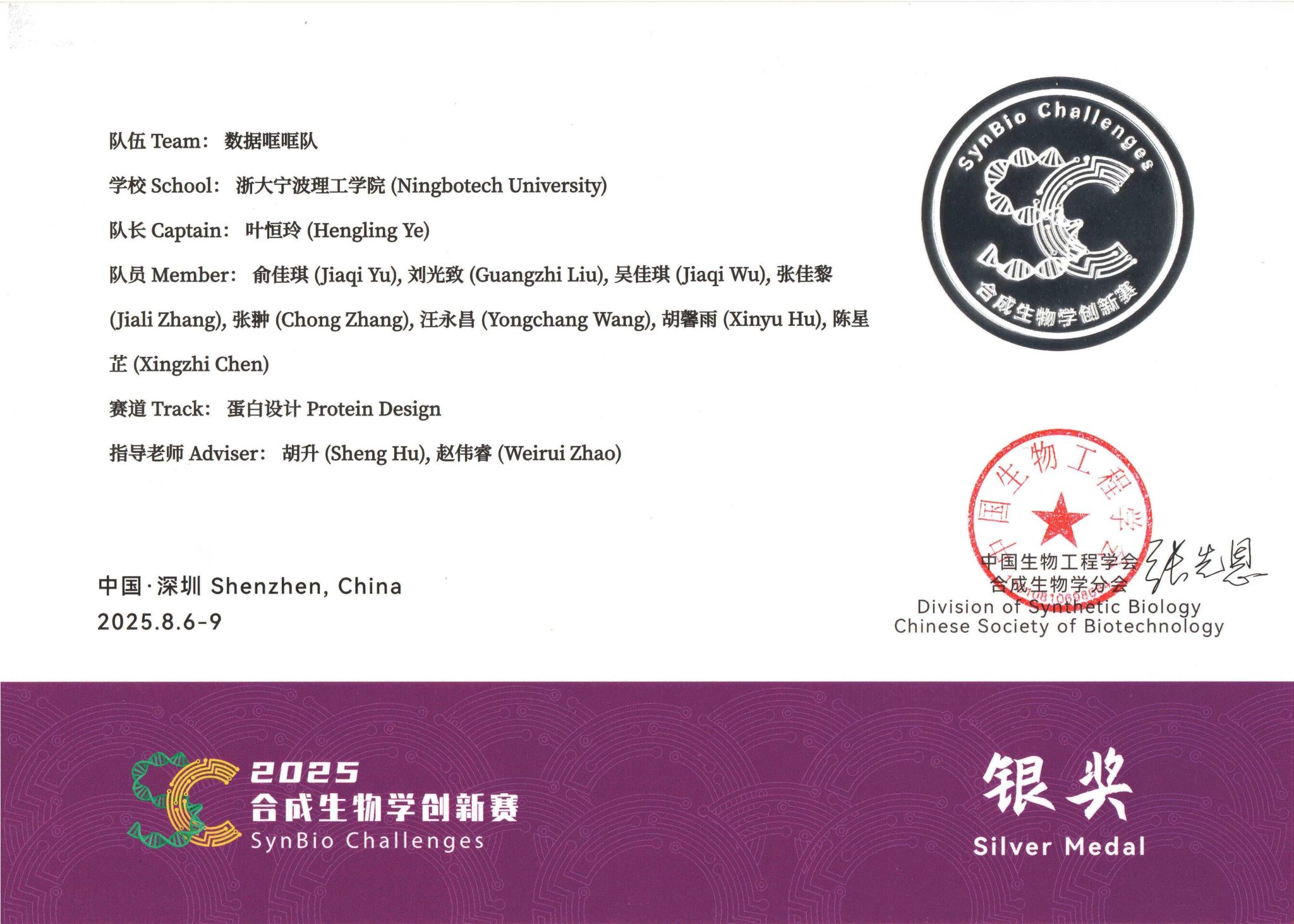 近日,由中国生物工程学会主办,中国科学院深圳先进技术研究院、国家生物制造产业创新中心等联合承办的第四届合成生物学创新赛(SynBio Challenges)决赛在深圳举行。生化学院生物工程系主任胡升、教师赵伟睿组织学生参加本次竞赛,其中“数据哐哐队”在激烈竞争中获得“蛋白设计赛”银奖。这也是生化学子继去年首次参加该项竞赛并获得“蛋白设计赛”银奖后再次获奖。