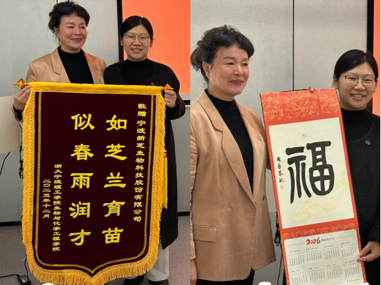 在全体师生的见证下,芦美丽老师为创新班第二期结业学员颁发了结业证书,并代表学院向新芝生物赠送锦旗,为企业在产教融合与人才培养中的突出贡献表达感谢。董事长周芳女士也特意为老师们精心准备了一份亲手书写的福字日历,祝愿学院全体师生笃学化福文脉长,尚行成德气象新。随后,创新班学院导师代表、生物工程系系主任胡升老师分享了创新班的教学理念与期许,强调“项目制学习”对能力整合的重要性。学生代表、化工专业研究生陆钟怡同学上台表达了对创新班的期待与努力学习的决心。