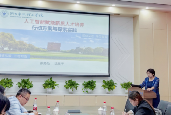 战略合作仪式结束后,召开了“人工智能赋能的产业创新人才培养”研讨会,会议由学院副院长吴志革主持。学校教务处处长沈昊宇介绍了学校人工智能赋能新质人才培养行动方案与探索实践