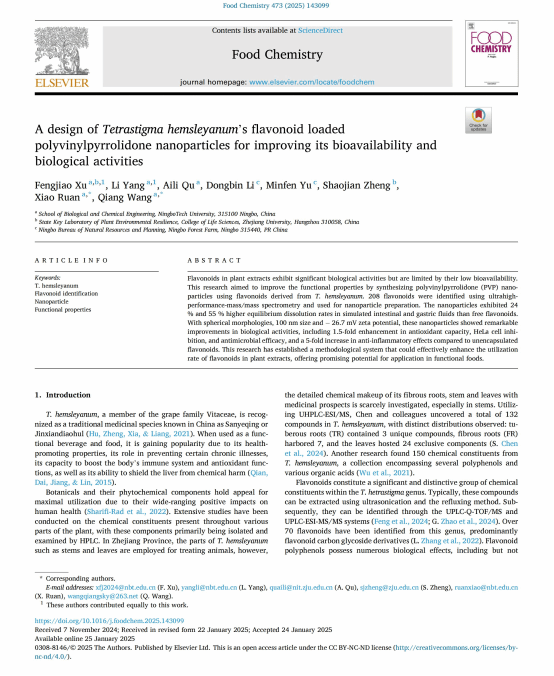 生化学院王强教授课题组徐风娇博士“A design of Tetrastigma hemsleyanum’s flavonoid loaded polyvinylpyrrolidone nanoparticles for improving its bioavailability and biological activities”在Food Chemistry发表论文(https://doi.org/10.1016/j.foodchem.2025.143099)。