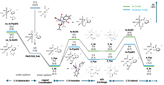 条件筛选中,团队发现:锰催化剂、配体结构、碱基选择、氘源及温度对收率和氘代率影响显著。通过一系列的优化实验,确定最佳反应条件为:Mn(CO)5Br(10mol%),Na2CO3(1equiv.),Ligand L2(0.1equiv.),NMP(0.5mL),D2O(0.5mL),在60℃下反应16小时,氘代率为1.94,产率为90%。接着进行了初步的密度泛函理论研究。基于已建立的CMD机理框架,含有吡啶酮的H/D交换显示C-H活化的能垒为9.0 kcal/mol,整个氘代过程的总能垒为10.0 kcal/mol。同时,以醋酸盐为CMD碱的无配体路径在起始阶段表现出更高的自由能,该路径的总能垒为11.1 kcal/mol。而球外C-H插入的能垒较高,其中吡啶酮L2和醋酸酯的活化能分别为15.1和14.7 kcal/mol。因此,吡啶酮应该作为一种内源性碱,促进可逆的C-H活化和随后的氢氘交换,从而促进整个氘代过程。